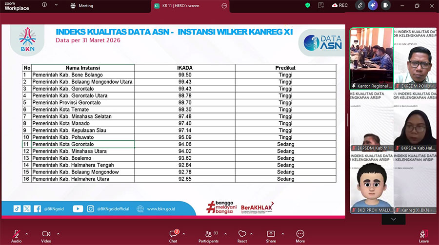 POHUWATO – Pemerintah Kabupaten Pohuwato melalui Badan Kepegawaian dan Pengembangan Sumber Daya Manusia (BKPSDM) terus berkomitmen meningkatkan akurasi data aparatur. Hal ini ditegaskan saat mengikuti Rapat Koordinasi Peningkatan Indeks Kualitas Data (IKD) ASN dan Skor Kelengkapan Arsip ASN Digital yang diselenggarakan oleh Kantor Regional XI BKN Manado secara daring pada Kamis (09/04/2026). Hadir mewakili Kepala BKPSDM, Kepala Bidang Pengadaan, Pemberhentian, dan Informasi Kepegawaian, Syaiful Safril Luma, m...