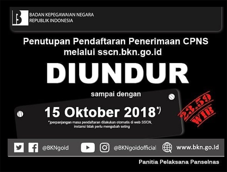 Pemerintah melalui Panitia Seleksi CPNS Nasional (Panselnas) memutuskan untuk memperpanjang masa pendaftaran CPNS via portal SSCN sampai dengan tanggal 15 Oktober 2018 pukul 23:59 WIB. Keputusan tersebut dilakukan dengan mempertimbangkan perkembangan terkini yang terjadi di beberapa daerah di Indonesia di antaranya yang terkena dampak bencana, seperti gempa Lombok, Nusa Tenggara Barat (NTB), serta gempa dan tsunami di Sulawesi Tengah (Sulteng).