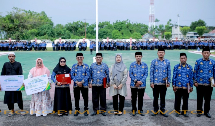 POHUWATO - Wakil Bupati Pohuwato, Iwan Syahruddin Adam memimpin langsung apel Korpri tingkat Kabupaten Pohuwato periode September, yang dirangkaikan dengan penyerahan SK Kenaikan pangkat, Piagam Satyalancana Karya Satya Masa kerja X, XX dan XXX tahun serta santunan duka bagi ahli waris ASN (Janda/Duda), pada Rabu (17/09/2025) di halaman kantor sementara Bupati Pohuwato.